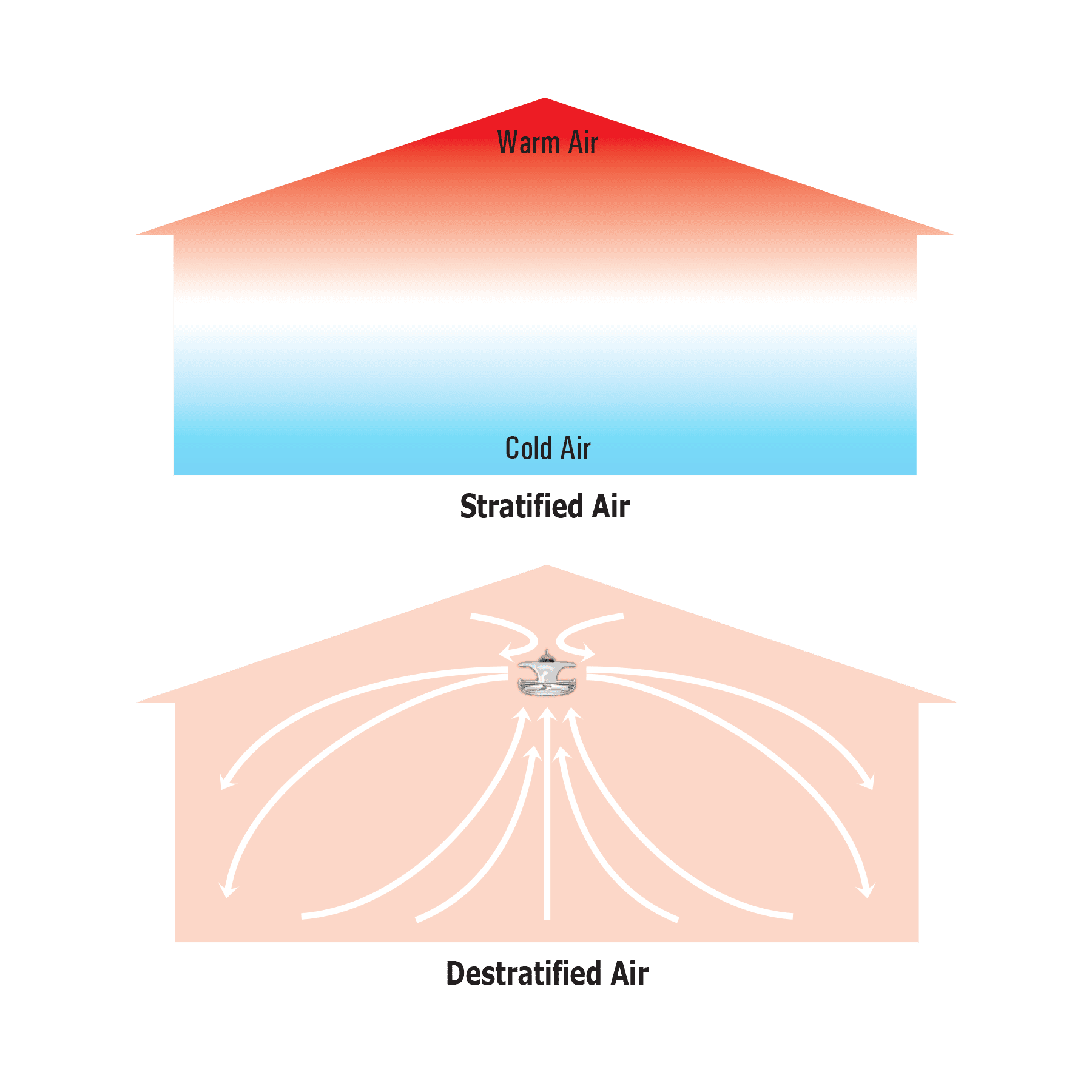 Greenhouses → eliminate roof-level heat zones, improve temperature uniformity.