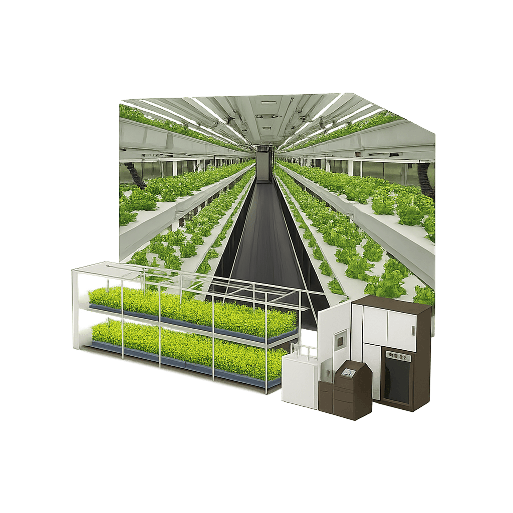Options: NFT/DFT hydroponics, coco/rockwool substrate drip, float trays, microgreens